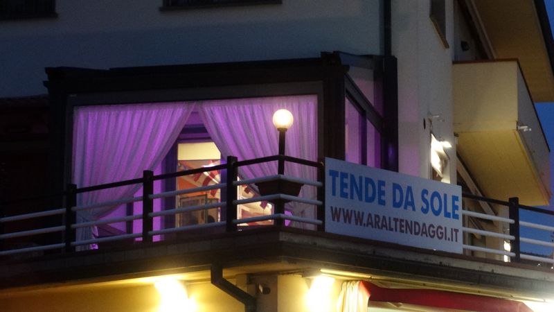 Pergolato in legno scorrevole con chiusure laterali con infissi e tenda ermetica frontale e tendaggio da arredamento